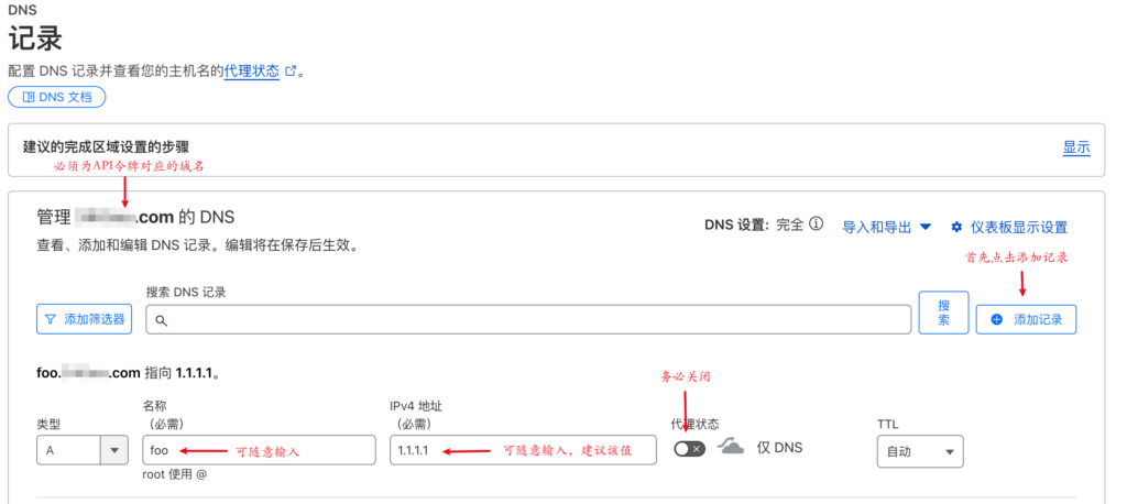 在“账号主页”,选择域名,并点击它跳转到新页面。然后从“DNS” – “记录”来添加新的记录。请务必确保代理状态为 关闭 。